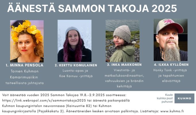 Jälleen on tullut aika valita Kuhmon Sammon Takoja 2025. Äänestys on käynnissä 19.8.-2.9.2025 ja vuoden 2025 Sammon Takoja julkistetaan Taiteiden yössä perjantaina 5.9.2025.