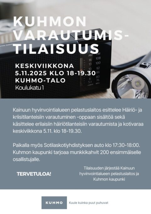 Kainuun hyvinvointialueen pelastuslaitos esittelee Häiriö- ja kriisitilanteisiin varautuminen -oppaan sisältöä sekä käsittelee erilaisiin häiriötilanteisiin varautumista ja kotivaraa keskiviikkona 5.11. klo 18-19.30 Kuhmo-talossa, Koulukatu 1.