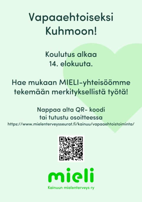 Koulutus käynnistyy Kuhmossa 14.8.2025. Voit hakea mukaan Mieli ry Kainuun verkkosivujen kautta https://www.mielenterveysseurat.fi/kainuu/vapaaehtoistoiminta