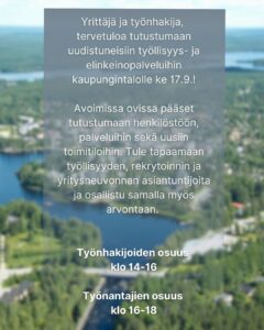 Aika: 17.9. 2025, työnhakijat klo 14 – 16, yrittäjät klo 16-18
