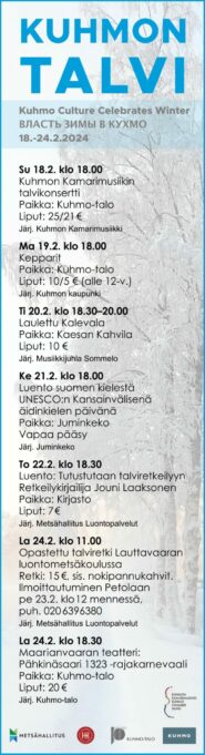 Kuhmon Talvi yhdistää kansainvälisestikin tunnustetut kuhmolaiset kulttuuritapahtumien järjestäjät, harrastajat ja taiteilijat. Luvassa on parasta kuhmolaista kulttuuria: musiikkia monessa muodossa, teatteria, tanssia, näyttelyitä ja kirjallisuutta.