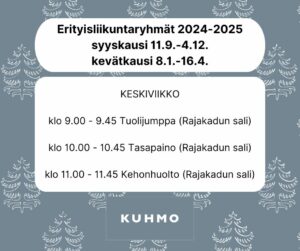 Liikuntaryhmät toimivat säännöllisesti viikoittain, poislukien loma-ajat ja juhlapyhät.