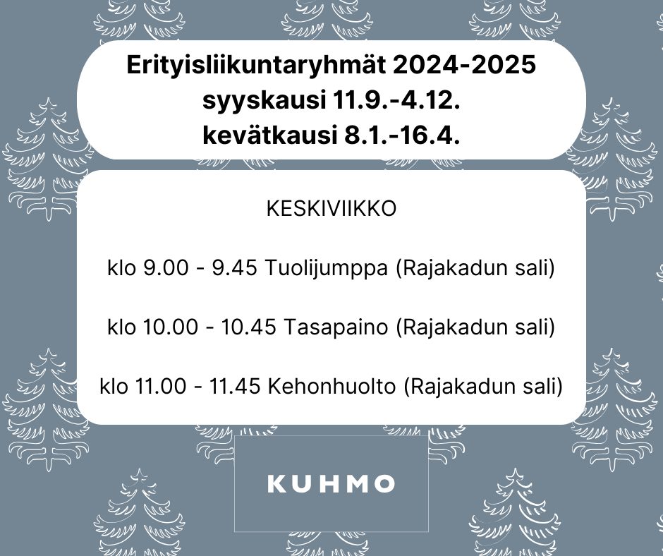 Kuhmon kaupungin monipuoliseen terveys- ja erityisryhmien liikuntaan ovat tervetulleita eläkeläiset, pitkäaikaissairaat, työttömät ja kohti liikunnallista elämäntapaa pyrkivät kuhmolaiset.