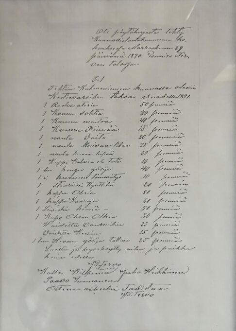 Kuva: Kievarihinnasto vuodelta 1890. Käytössä olivat markat ja pennit.