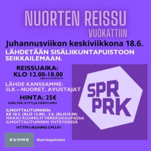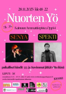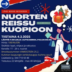 Reissun ikäraja: 13-29v. Hinta: Kuhmolaisille maksuton (pääsylippu, ohjaus, kyyditys ja vakuutus on sponsoroitu) Mukaan mahtuu 20 nuorta. Ilmoittautuminen verkkokaupan kautta. Ilmoittautuminen päättyy 18.11. klo 18.00, jonka jälkeen ilmoittautuminen on sitova. Viikkoa ennen reissua osallistujille lähetetään tietoa puhelimitse. Reissuun lähdetään linja-autoasemalta, myös matkanvarrelta voi nousta kyytiin. Sotkamosta nousee myös nuoria mukaan. Pysähdymme Sotkamossa myös Lidlissä. Voit ostaa oma kustanne eväät. Tapahtumaan voi viedä sisälle avaamattomat juoman ja evään. Reissu ja Nuorten yö tapahtuma on päihteetön ja energiajuomaton. Tapahtumapaikan ovella on turvatarkastus.