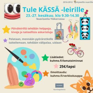 Kuhmon nuorisopalvelut ja liikuntapalvelut, Kuhmon kaupungin kirjasto, Kuhmon yhtenäiskoulu, Kuhmon 4H ja Kuhmon seurakunnan nuorisotyö tarjoaa loma- ja tapahtumatoimintaa lapsille ja nuorille. Tältä sivulta pääset valitsemaan mieluisimmat toiminnat. Toiminnat ovat maksuttomia, jos hintaa ei ole mainittu. Osaan toiminnoista on ennakkoilmoittautuminen, ilmoittaudu ajoissa. Lisätietoja saat toiminnoista järjestävältä taholta.