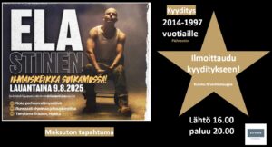 Kuhmosta lähdetään klo 16.30 – paluun klo. 23.30. Mennessä Sotkamossa pysähdymme kauppaan, voit omakustanteisesti ostaa evästä.