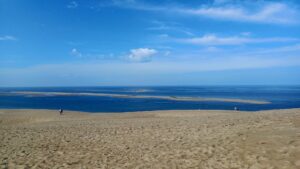 Sunnuntaina pääsimme tapaamaan toista ranskalaisystäväämme, Frédéric Guyard’ia ja Catherine Loustau’ta sekä hänen poikaansa. Pääsimme kiipeämään alueen suosittuun kohteeseen upeille Dune du Pila -dyyneille. Hiekassa kahlaaminen ja paluumatkalla juokseminen kuuluvat ranskalaiseen retkeilytraditioon. Korkealta dyynien päältä katsottuna maisemat Atlantille olivat upeat.