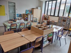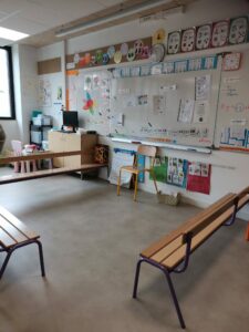Tutustuimme myös luokkaan, jossa opiskeli eri-ikäisiä oppilaita yhden opettajan johdolla. Oppilaat istuivat luokassa luokka-asteet sekoittuen, ja näin isommat oppilaat voivat luontevasti auttaa nuorempiaan. Yhdysluokan opettaja ei kokenut työtään haastavana vaan oli työskennellyt samalla tavalla jo muutaman vuoden. On huomionarvoista, että ranskalaisessa koulussa keskitytään toiminnalliseen pedagogiaan kirjapainotteisuuden ja digitaalisuuden sijaan.