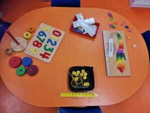 Kun kirjoittamisharjoitus oli tehty valmiiksi, voitiin siirtyä aarrepurkille. Lapset istuivat odottavaisina piirissä tuoleillaan. Aarrepurkin tavaroiden avulla harjoiteltiin kymppiparien löytämistä. Kun näkyvillä on kolme esinettä, montako puuttuu kymmenestä?