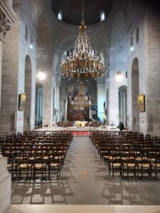 Aluksi tutustuimme Eglise Monolithe -kirkon historialliseen kokonaisuuteen. Asiantunteva opas johdatteli meidät maanalaiseen, kiveen louhittuun kirkkoon ja katakombeihin. Kirkko on hieno taidonnäyte varhaiskeskiaikaisesta kädentaidosta. Kellotorni sijaitsee 53 metriä korkealla kirkon päällä, ja sieltä on hienot näkymät yli viininviljelyalueiden.