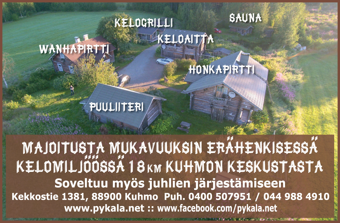 Kelomiljöö erämaaluonnon keskellä, noin 18 km päässä Kuhmon keskustasta, tarjoaa majoitusta mukavuuksin ympäri vuoden. Voit valita idyllisen Wanhan Pirtin (90 €/vrk), tunnelmallisen Keloaitan (Ison puolen 60 €/vrk tai Pikkusviitin 40 €/vrk) tai upean Honkapirtin (110 €/vrk) sopimuksen ja tarpeittesi mukaan tai koko Pykälän (300 €/vrk). Saunoja on kaksi; Lähdelammen rannalla sähkölämmitteinen, maakattoinen kelosauna ja Honkapirtissä myös sisäsauna.